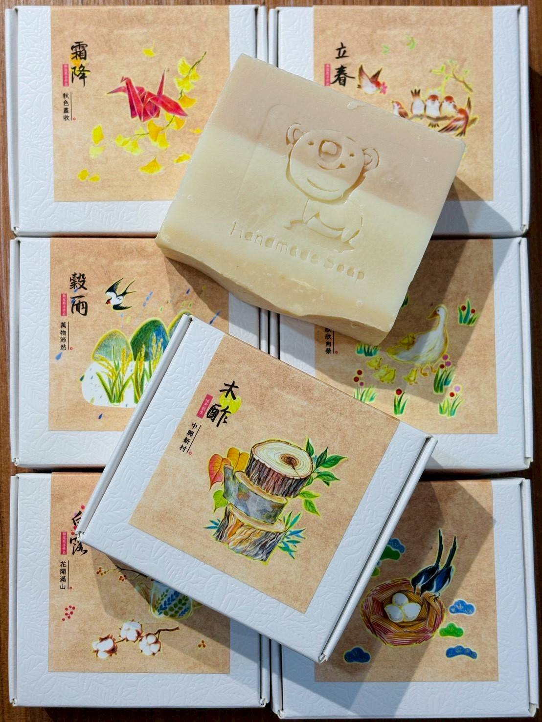 八塗文創以「二十四節氣」為靈感,將自然節奏轉化為視覺語言,為節氣家事皂量身打造極具詩意的包裝設計,讓傳統節氣在日常中被重新認識與感受。