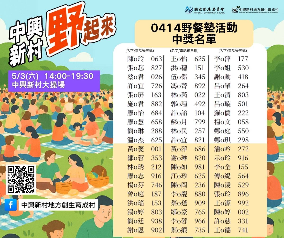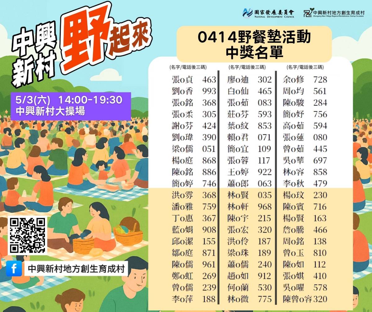 感謝大家熱情報名「中興新村野起來─野餐 MUSIC 創生市集」限量野餐組抽籤活動,今日共抽出幸運的120組中獎名單✨快來看看自己有沒有中獎~