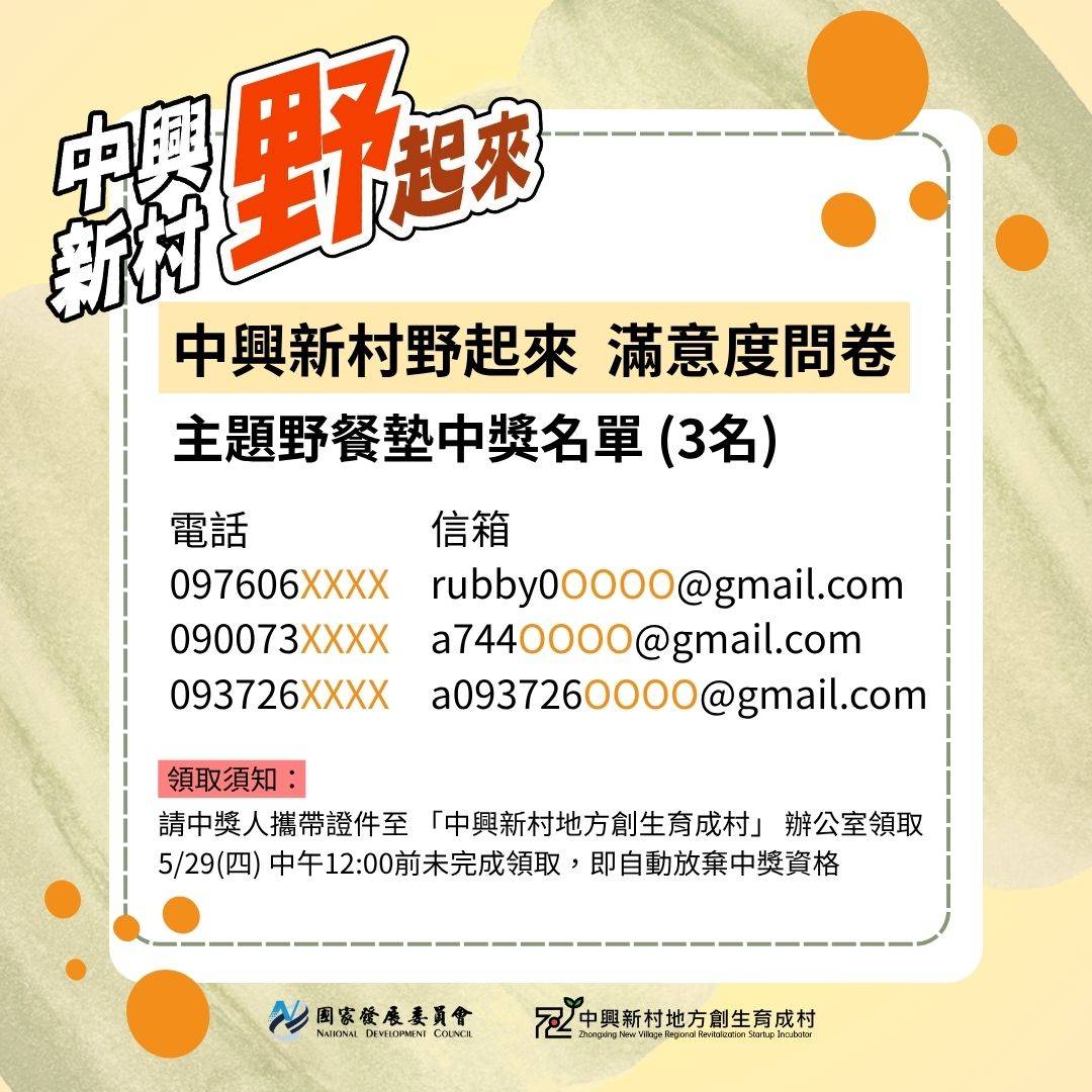 【中興新村野起來─活動滿意度問卷中獎名單公布】🎉