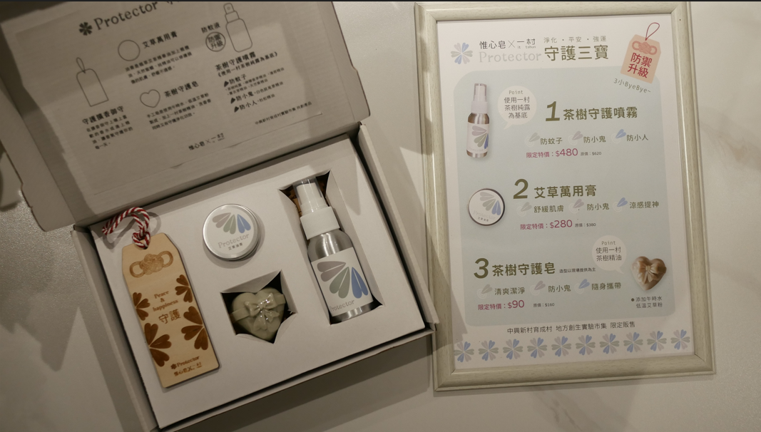 透過村內的廠商媒合會,她與一村精油團隊合作,聯名推出「守護三寶」禮盒,結合彼此專長,共同申請補助、發想企劃,不只提升曝光度,也打開地方市場的另一扇門。這種合作模式,不僅讓產品更有競爭力,也帶動在地產業鏈的形成,從原料農戶、設計師、包裝印刷,到販售通路,串起一條屬於地方的微型產業網絡。